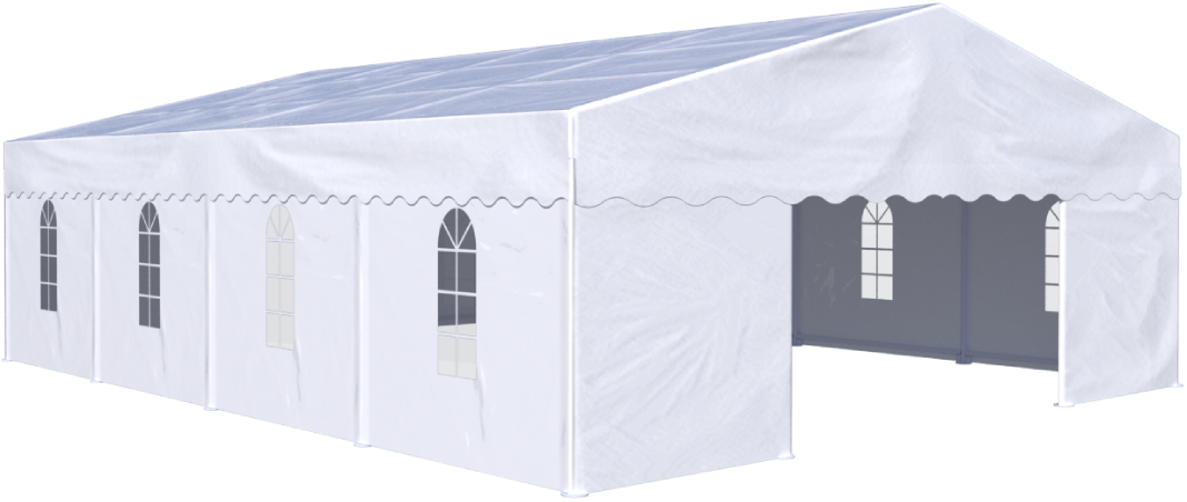 La tente de chapiteau professionnelle a des dimensions de 3,5x10x8m. Il est élégant et festif. Convient pour les festivals, les expositions, la communication, les mariages et diverses occasions. Avec un poids total de 590kg. Fait de bâche en PVC de haute qualité de 700 grammes. Ce tissu se caractérise par sa bonne résistance à la chaleur de 30 à 70+ degrés Celsius et au rayonnement ultraviolet. La tente est étanche à %100. Il est soutenu par des bases stables et épaisses, qui résistent aux vents de 80 à 100 km / h..