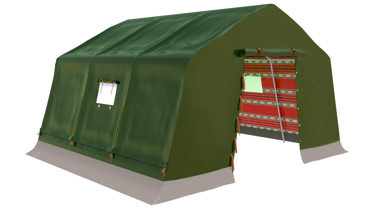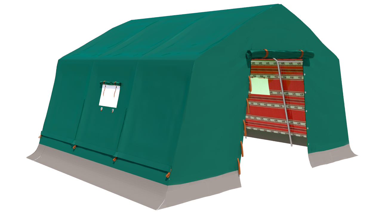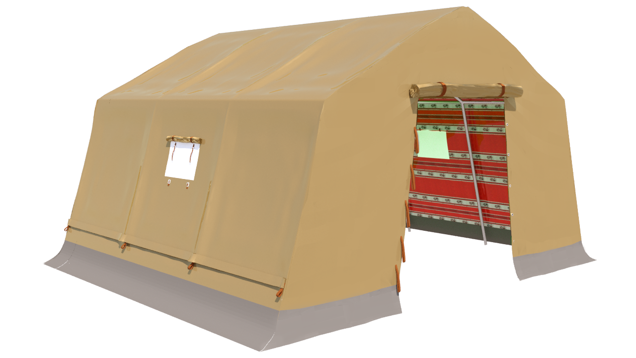 Une tente à double couverture faite de deux couches de tissu extérieur en coton de haute qualité et de la deuxième couche intérieure de tissu Sadu dans un style traditionnel. Il peut accueillir deux personnes, conçu pour être facile à transporter et à stocker, et rapide à démonter et à installer. Il a une porte et deux fenêtres, d’un poids total de 102,80 kg, soutenues par des bases fermes et épaisses qui résistent à des vents de 90 m. jusqu’à 100 km / h et une température de 30 à 70 + degrés Celsius, adapté à de nombreuses utilisations spéciales (voyages, voyages, randonnées… etc.) en plus du travail sur le terrain dans diverses conditions..